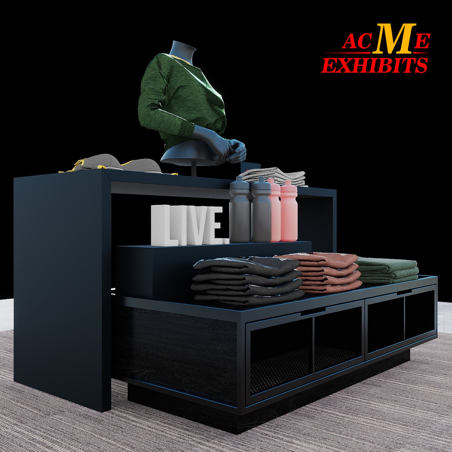 l Ample Display Space: Multi-tier shelving provides room for folded apparel, mannequins, and promotional props.