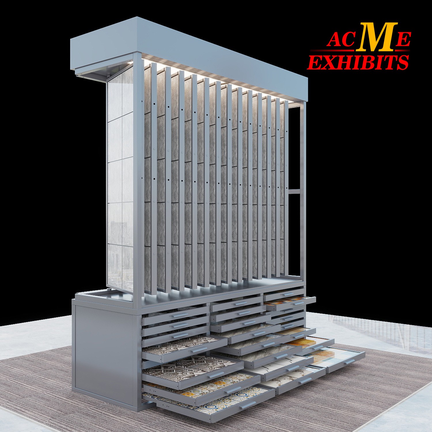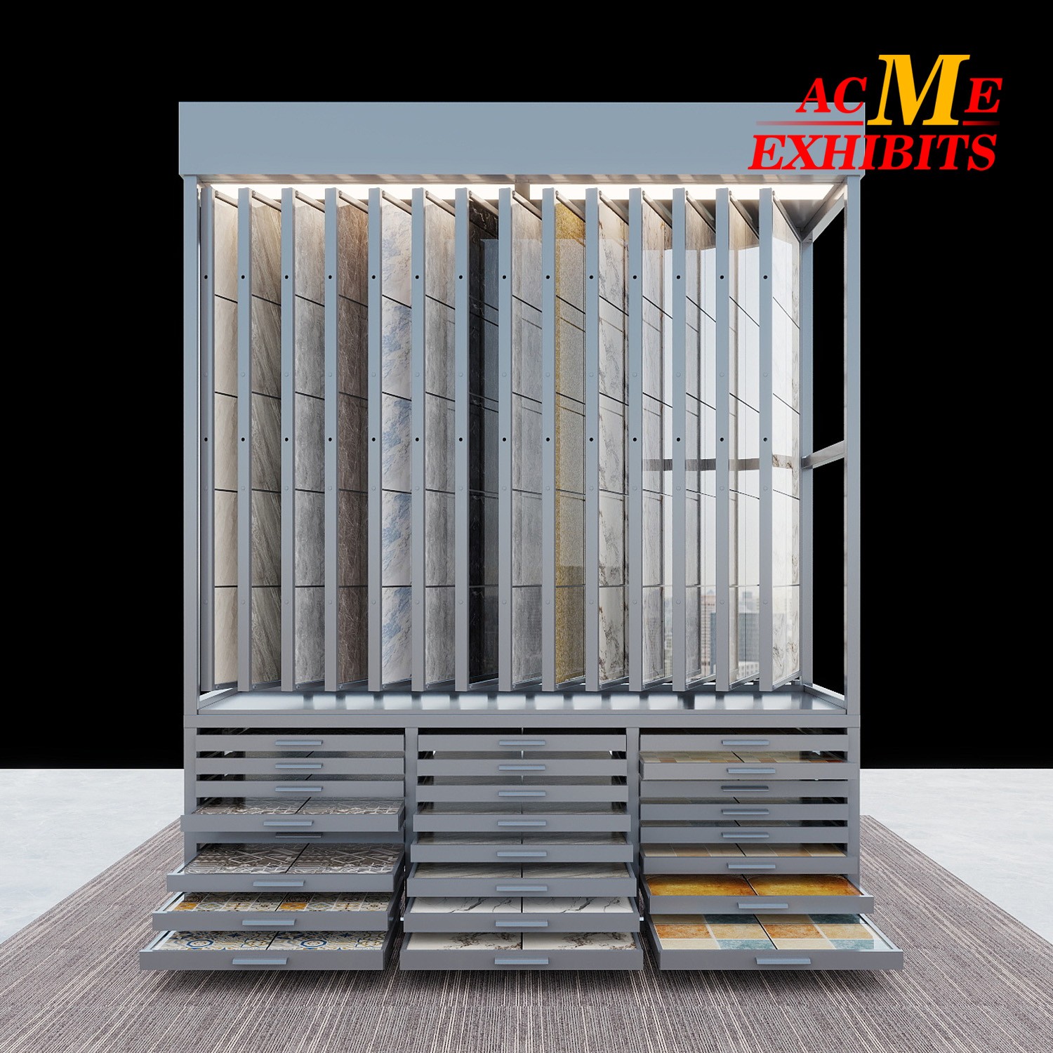 This professional sliding-panel display rack is engineered for presenting large stone, tile, and building material samples with maximum efficiency and visual impact. Ideal for construction, interior, and material suppliers at trade shows.