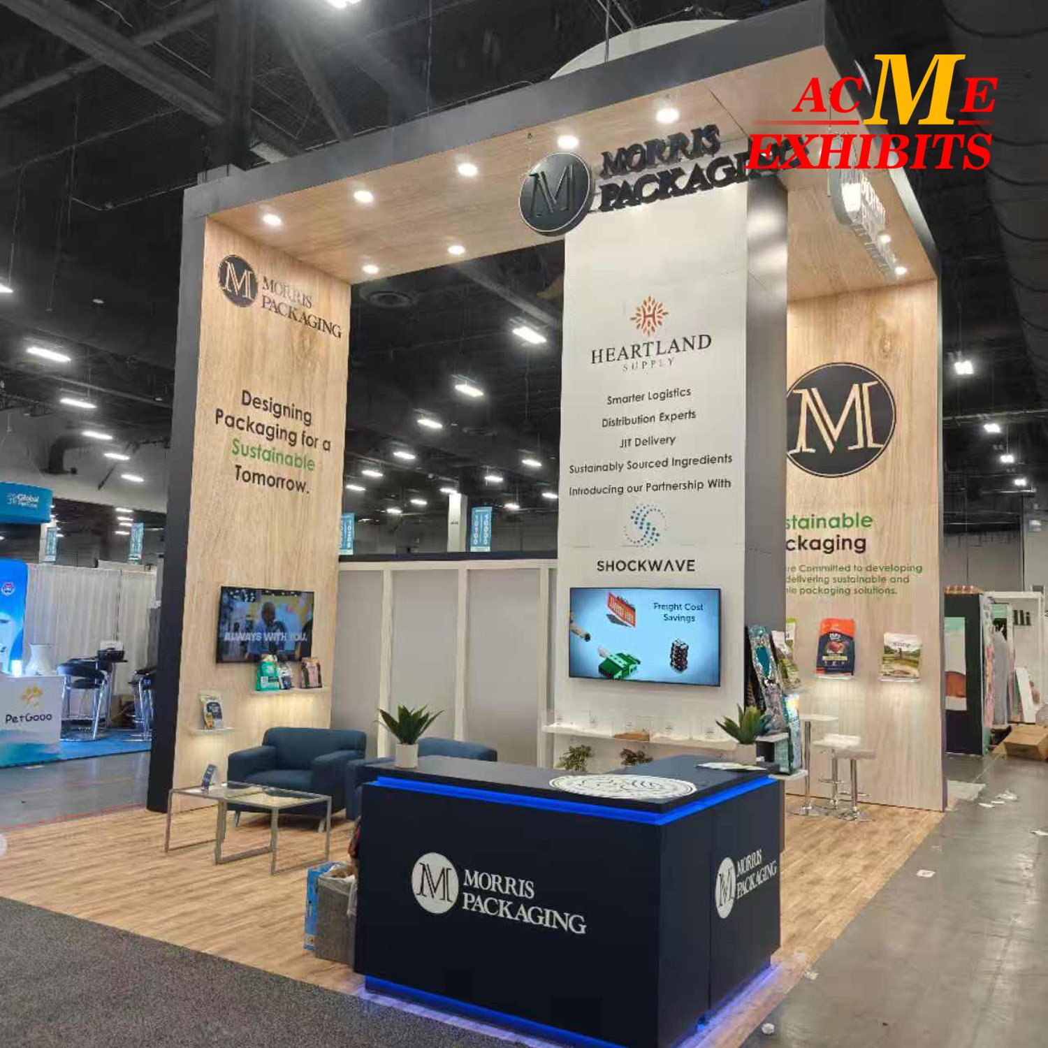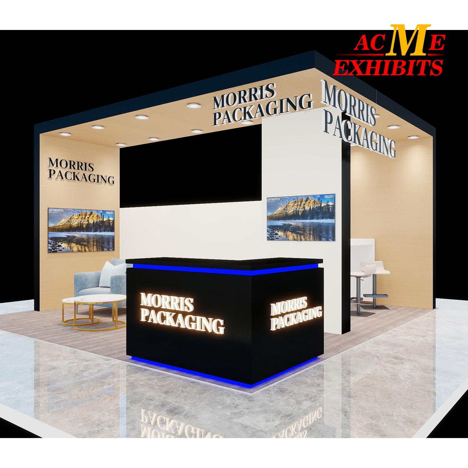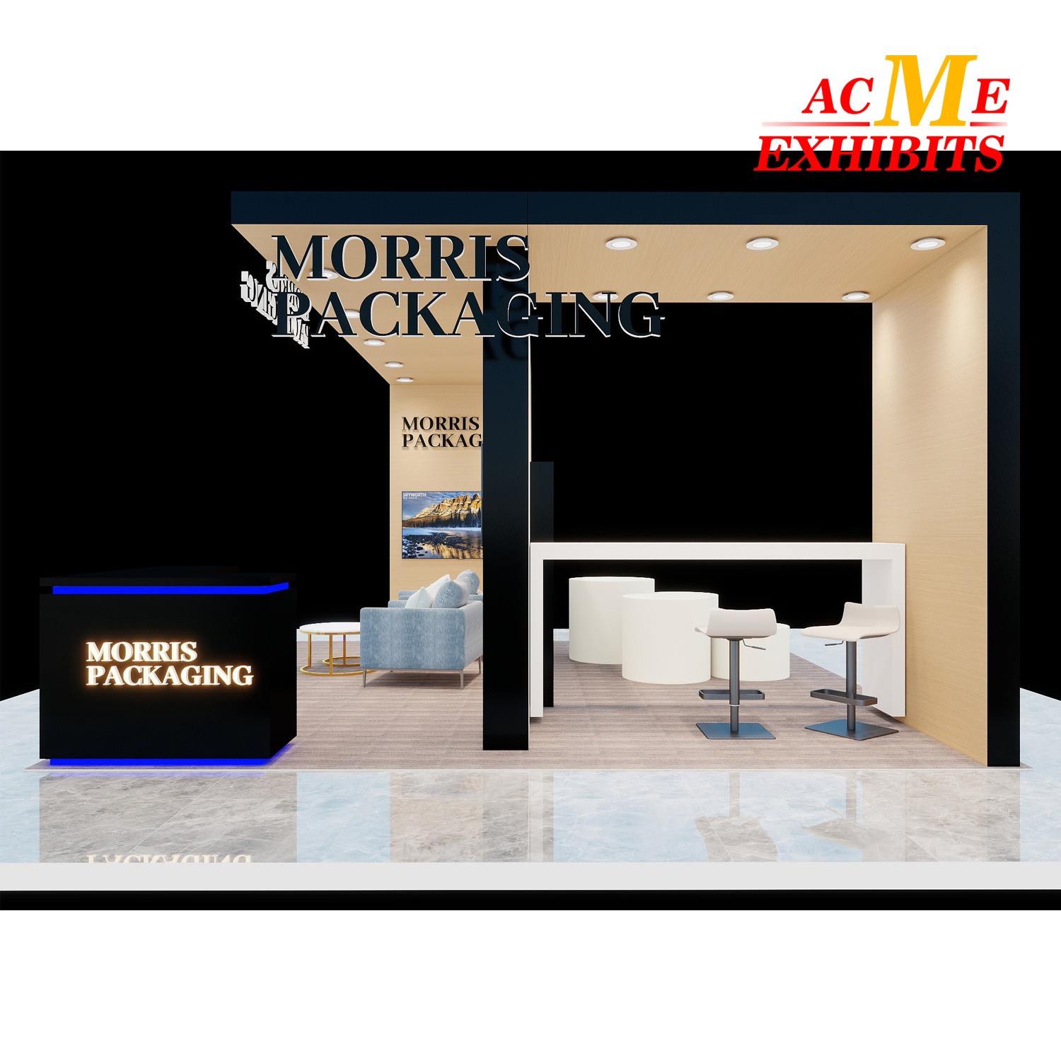 The booth combines natural textures and clean geometry to convey a professional and approachable image. The illuminated counter serves as a focal point, while the open frame increases visual depth and brand presence.