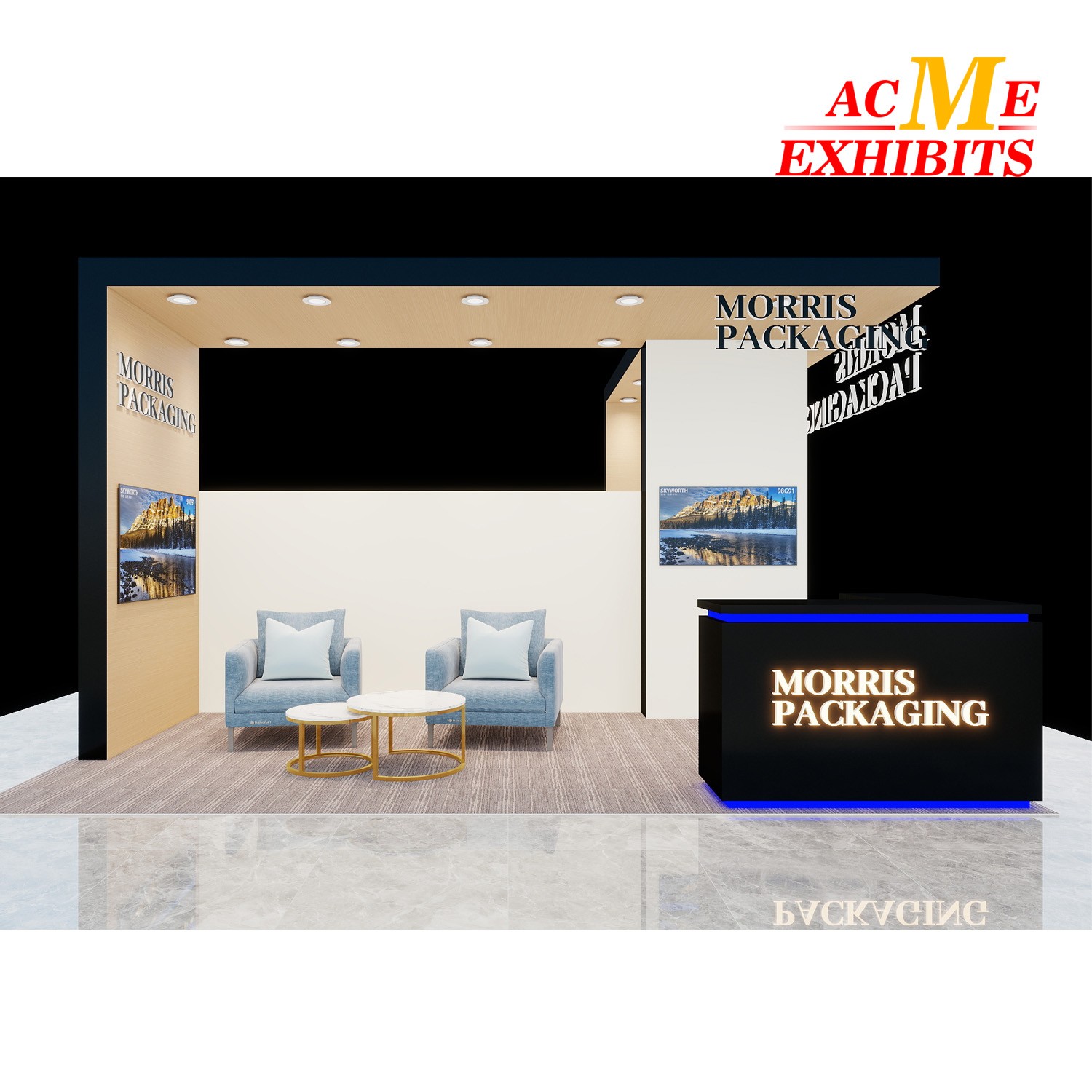 The booth combines natural textures and clean geometry to convey a professional and approachable image. The illuminated counter serves as a focal point, while the open frame increases visual depth and brand presence.