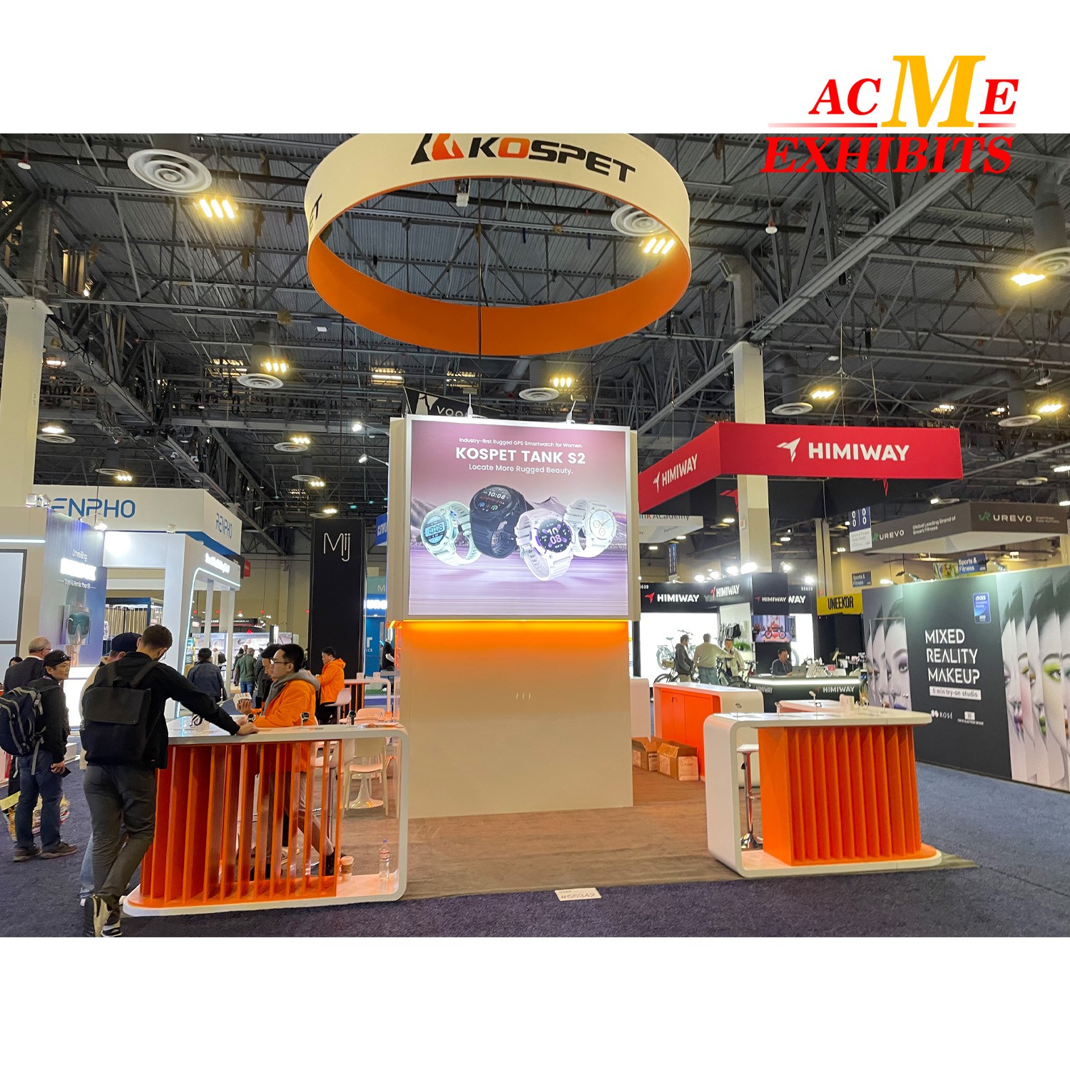 This booth creates a powerful brand presence with elevated signage and vibrant visuals. By combining LED content, bold colors, and interactive counters, it effectively showcases KOSPET’s smartwatches while enhancing visitor engagement at the exhibition.